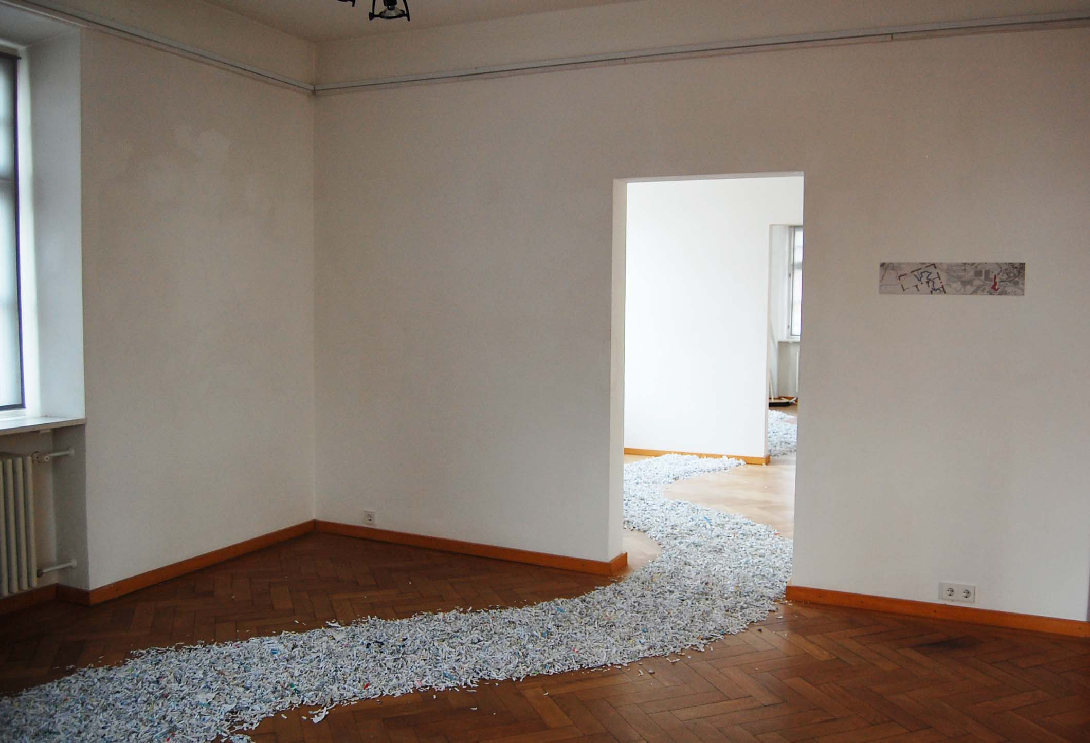 Im Grunde werden drei Ausstellungen gezeigt, doch haben die Arbeiten zwei gemeinsame Aspekte gemeinsam - Papier und Wasser. Stefanie Kraut und Willi Weiner nutzen bereits gebrauchtes Papier, um daraus Neues zu schaffen und so den Rohstoff- und Produktionskreislauf zu betonen. Stefanie Kraut gibt in ihrer Installation dem Altpapier eine Bühne. Was vorderhand nach „Papierfetzen" aussieht, schlängelt sich wie in einem Fluss von Raum zu Raum, begleitet von einer Diaschau und Projektionen.
